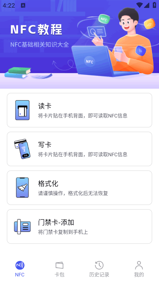NFC万用读卡专家app是一款简洁清爽干净好用的nfc门禁公交卡管理应用,支持NFC门禁卡、公交卡等IC卡的读取和写入操作,可将IC卡信息凭证封装成数据包,存储在支持NFC的外设中,为用户提供IC卡格式化功能,满足用户对卡片数据的重置需求。