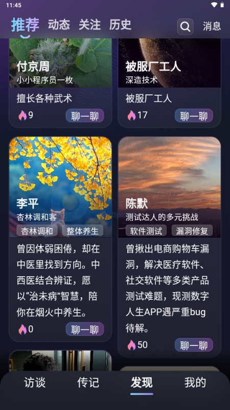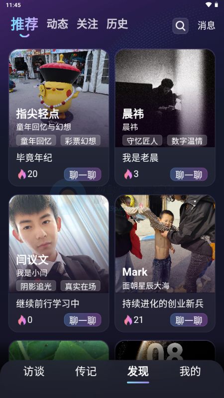 5. 发现:你可以与他人的数字分身互动,倾听他们的故事,或向他们的分身提问、交流。你还能浏览他人发布的动态与传记,感受不同人生的温度与共鸣。这里是一座充满生命故事的数字广场,每一次遇见,都是一次灵魂的相互照亮。