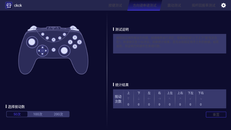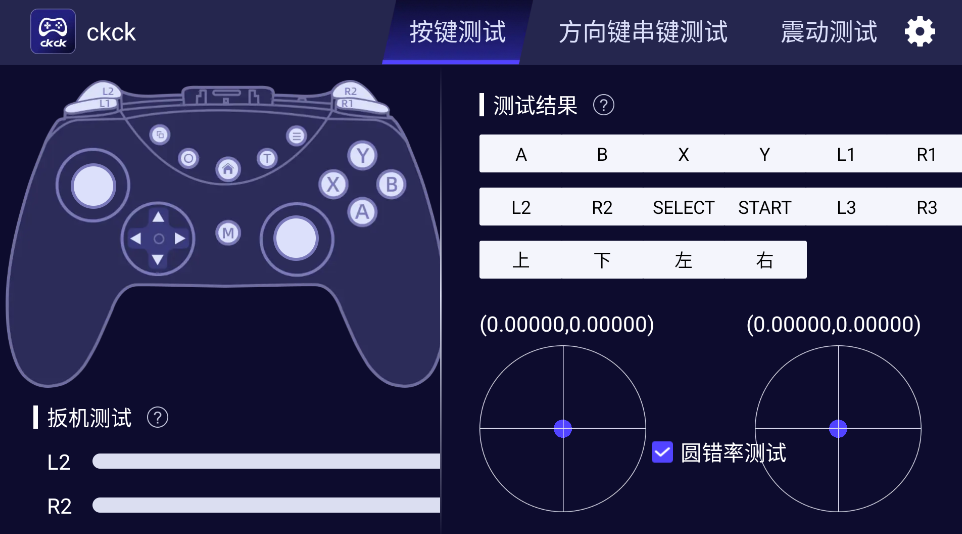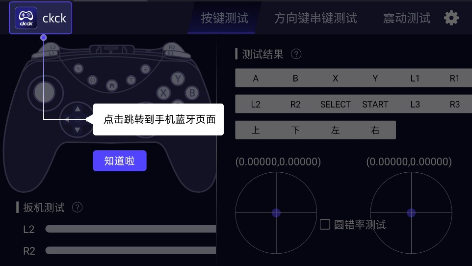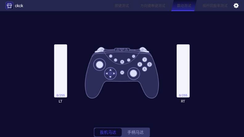 ckck是一款专业支持 Xbox、PS、Switch Pro、Android HID等蓝牙游戏手柄和支持X-input有线游戏手柄的链接测试的工具。可以方便用户对游戏手柄按键功能、摇杆性能、方向键性能、手柄震动和摇杆回报率进行专项测试。