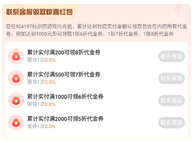 任意款4197标识游戏内累充满指定金额,即可在【福利中心】页面下拉联系客服领取满减5-8折券(每档限一次)