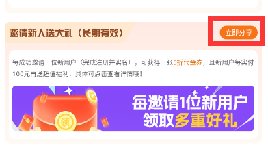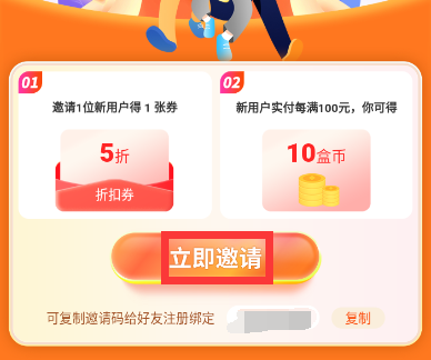 通过【邀请新人送大礼】活动,分享下载链接给新用户。新用户成功下载安装,并填写邀请码进行注册,即可获得一张5折券。后续新用户实付每满100元,可再领10盒币奖励!