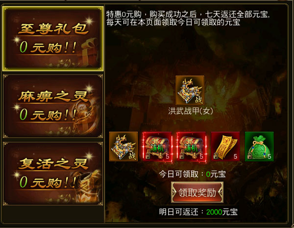 6、购买0元礼包,各种神装材料,七天返还全部元宝!