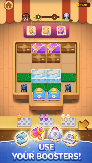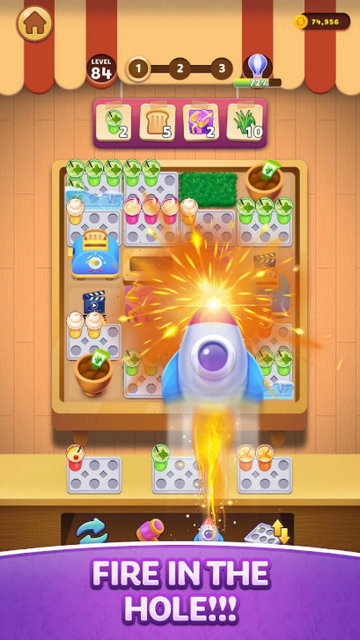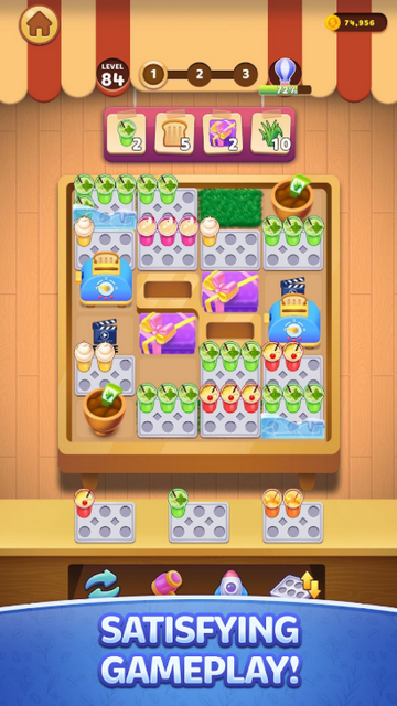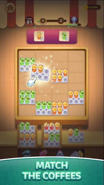 2、将相同颜色的咖啡包组合成六包,即可完成订单,获得积分并释放棋盘空间。