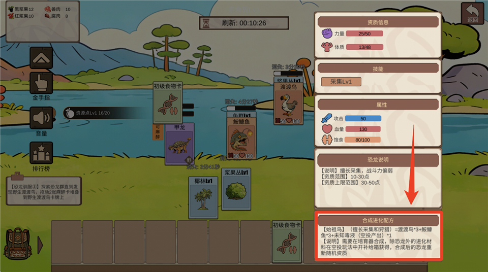 1)每个恐龙点击卡片可以在合成配方处看到该恐龙的具体进化合成方式。