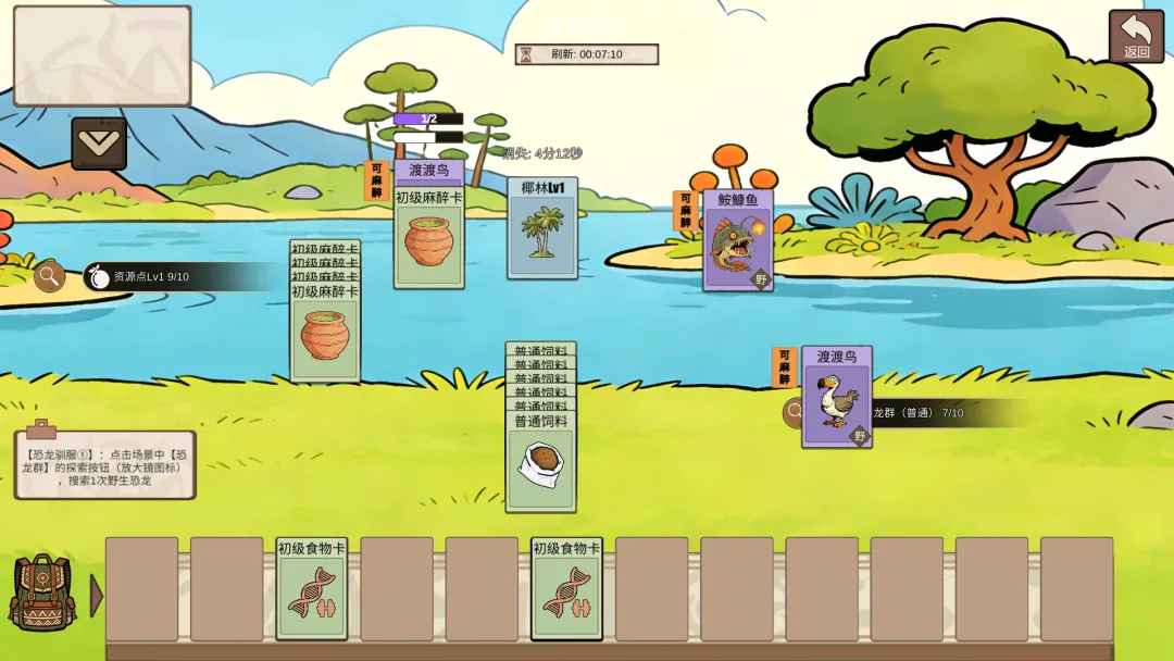 收恐龙以渡渡鸟为例子,两张麻醉和两张饲料,麻醉需要10点资源和2木头,总计12点资源,4张卡总计消耗48点资源,也就是说一张渡渡鸟的100体力可以换取100点资源,只有52点资源是纯赚的。跟着新手任务做的,最后收个甲龙要6张麻醉卡的我难受。