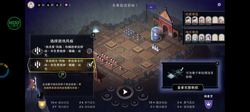 1、战斗开始前,我们可以选择自己的游戏风格,分为半自动和手动。