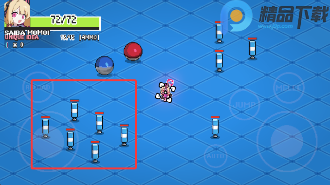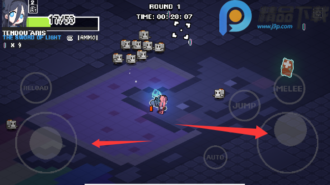 4、使用左下角控制移动,右下角控制射击方向,reload装弹,AUTO自动射击,jump跳跃,melee近战
