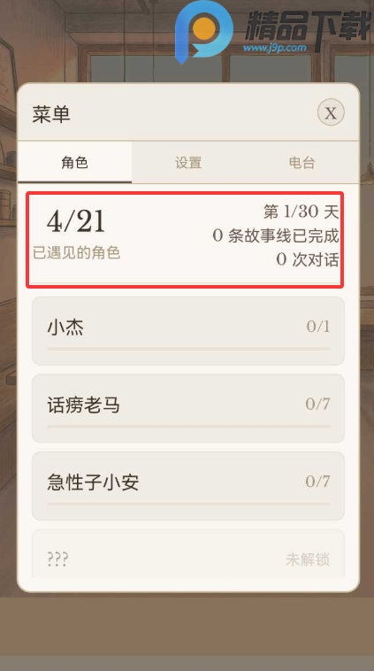 3、在菜单中可以看到已遇见的角色和解锁的故事线