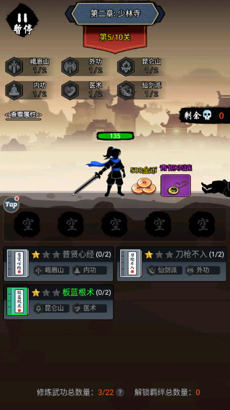 3、每次通过关卡都可以学习一个新的武学。
