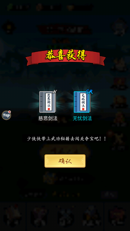 闯关、扫荡、挂机、商城抽奖时都有机会得到武功秘籍。