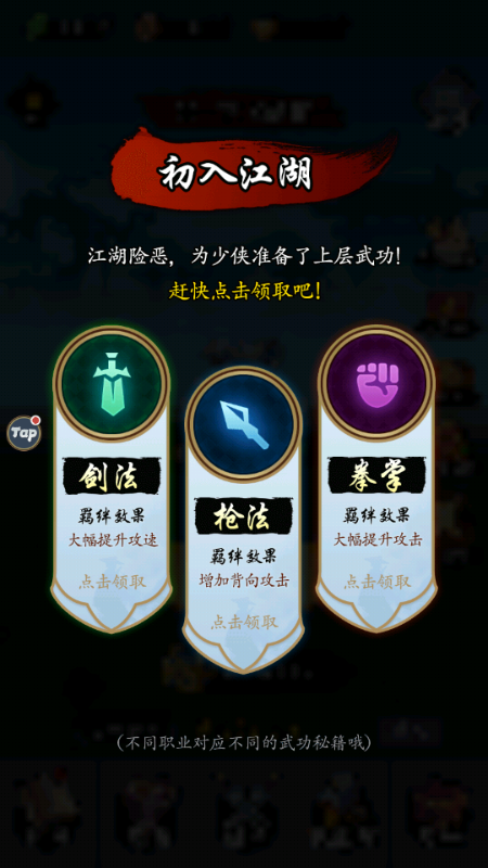 每一种武功都有门派和职业属性,凑齐一定数量相同门派或职业的武功可以激活相应羁绊,大幅提升战力,一定要注意武功阵容搭配,激活强力的羁绊组合。