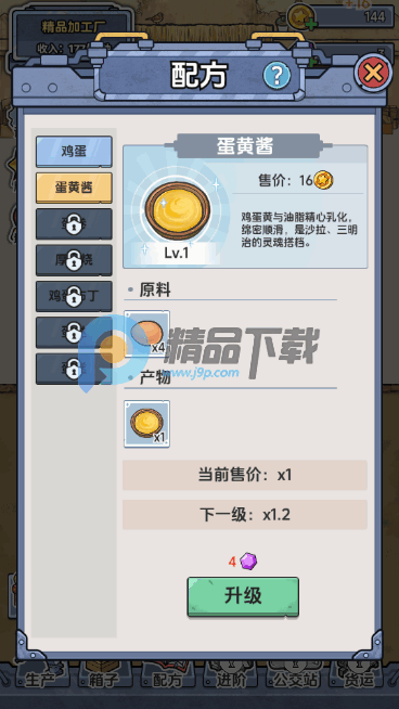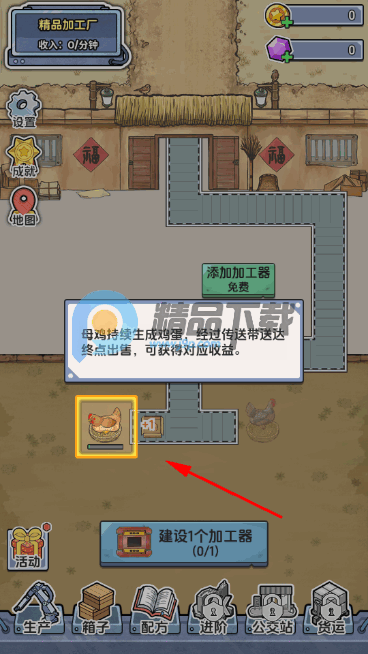 加工与转化:沿途搭建各类加工工厂(如清洗、包装、烘焙等),将基础鸡蛋原料逐步转化为高价值商品(如礼盒蛋、蛋糕等),并自动出售赚取金币。