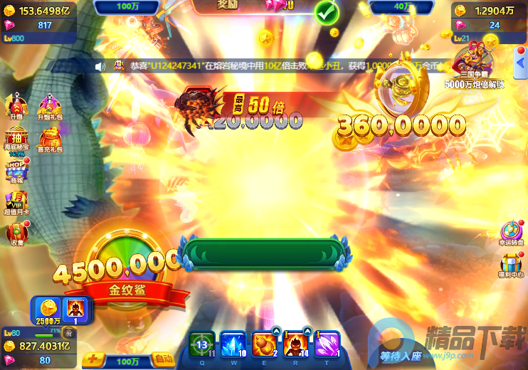 炮台系统:炮台支持10-10000倍率自由切换,升级可提升捕获概率与金币收益,但需消耗对应倍率金币。高等级炮台配备特殊子弹与击杀特效,VIP玩家可解锁自动开炮功能。