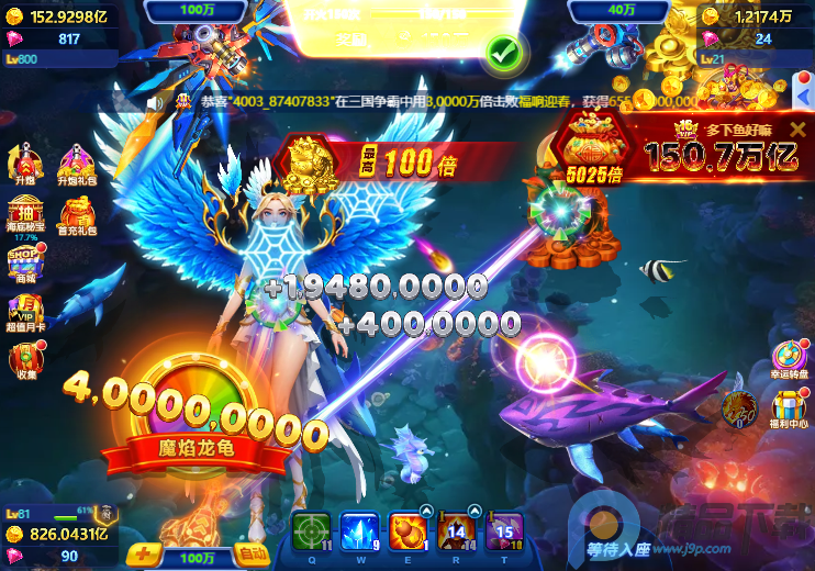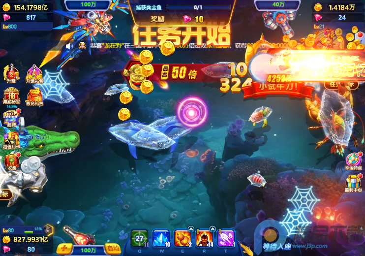 场景与目标:游戏设置浅海、深渊火山、时空漩涡等动态场景,鱼群沿真实抛物线游动,玩家需捕捉普通鱼、奖金鱼、BOSS鱼(如海王、金龙、女巫海鲨)获取金币奖励,不同鱼种分值差异显著。