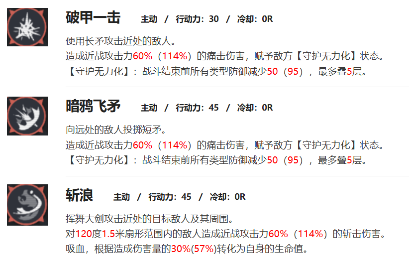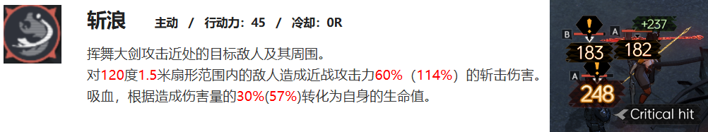 斩浪没有破防效果,但多了AOE与吸血。以造成的总伤害按技能倍率吸血,AOE越多,回的越多。