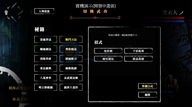 参考经典武侠养成系统,玩家可在自由时间进行训练。透过提升体魄、神识、劲道、气脉、悟性等五大属性,强化武功的伤害。